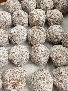 А уже вчера сладкие шары — Шьямы ( бисквит, крем: масло+ сгущенка, грецкий орех, клюква и кокосовая стружка сверху ) поедут к детям: